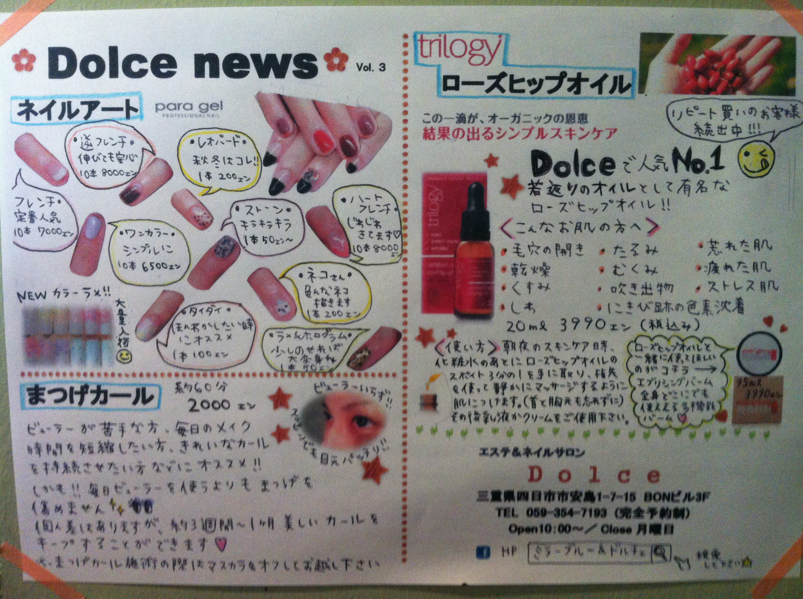 Dolce news出来ました♪♪♪ 投稿日時: 2013/1/12(土) 投稿者: 管理人 今回でvol.3となりました~~~。 オススメのネイルアートや 女子力アップのまつげカールのメニューに 大人気のローズヒップオイルのご紹介となっております。 本日よりDolceにお越しのお客様にお配りしていますよ~。 そして最近のララ&ミミ 仲良くシェアしてます!! 共有:シェア Facebook で共有 (新しいウィンドウで開きます) Facebook